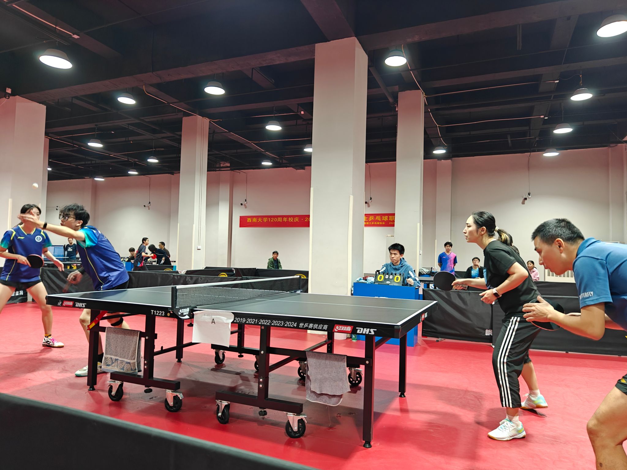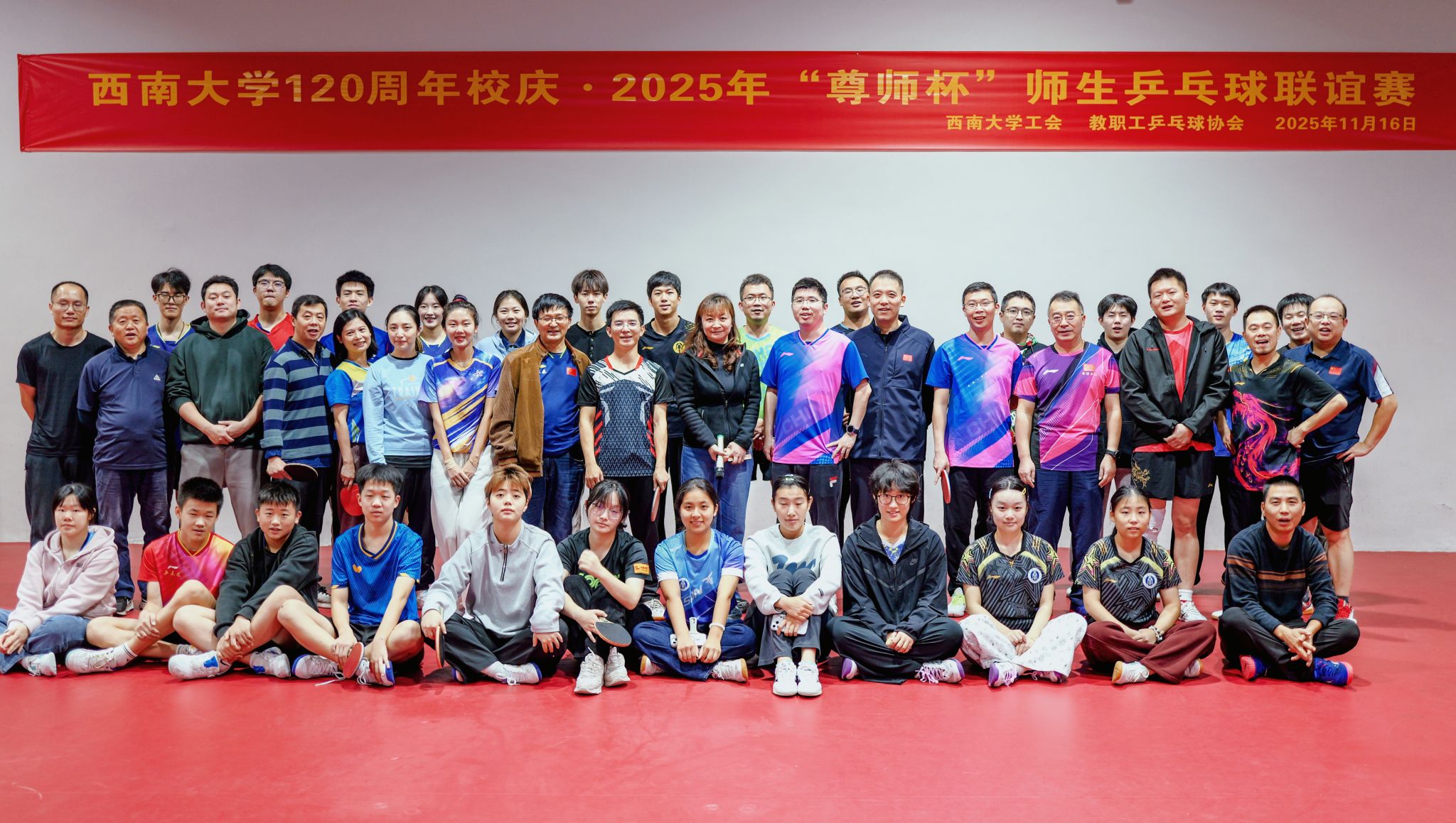 为庆祝西南大学120周年华诞,弘扬校园体育文化,促进师生交流,2025年11月16日,由西南大学工会主办、西南大学教职工乒乓球协会承办的“120周年校庆乒乓球师生联谊赛暨2025年‘尊师杯’师生联谊赛”在北碚区乒未来乒乓球馆成功举办。本次比赛吸引了来自全校教职工、运动训练专业学生、公共体育学生、附属中学学生及特邀嘉宾组成的多支队伍同场竞技,以球会友,共庆母校双甲子诞辰。